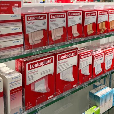 Arznei, Medizin- und Drogerieprodukte lassen sich mit einem Warenvorschub and die vordere Regalkante schieben.